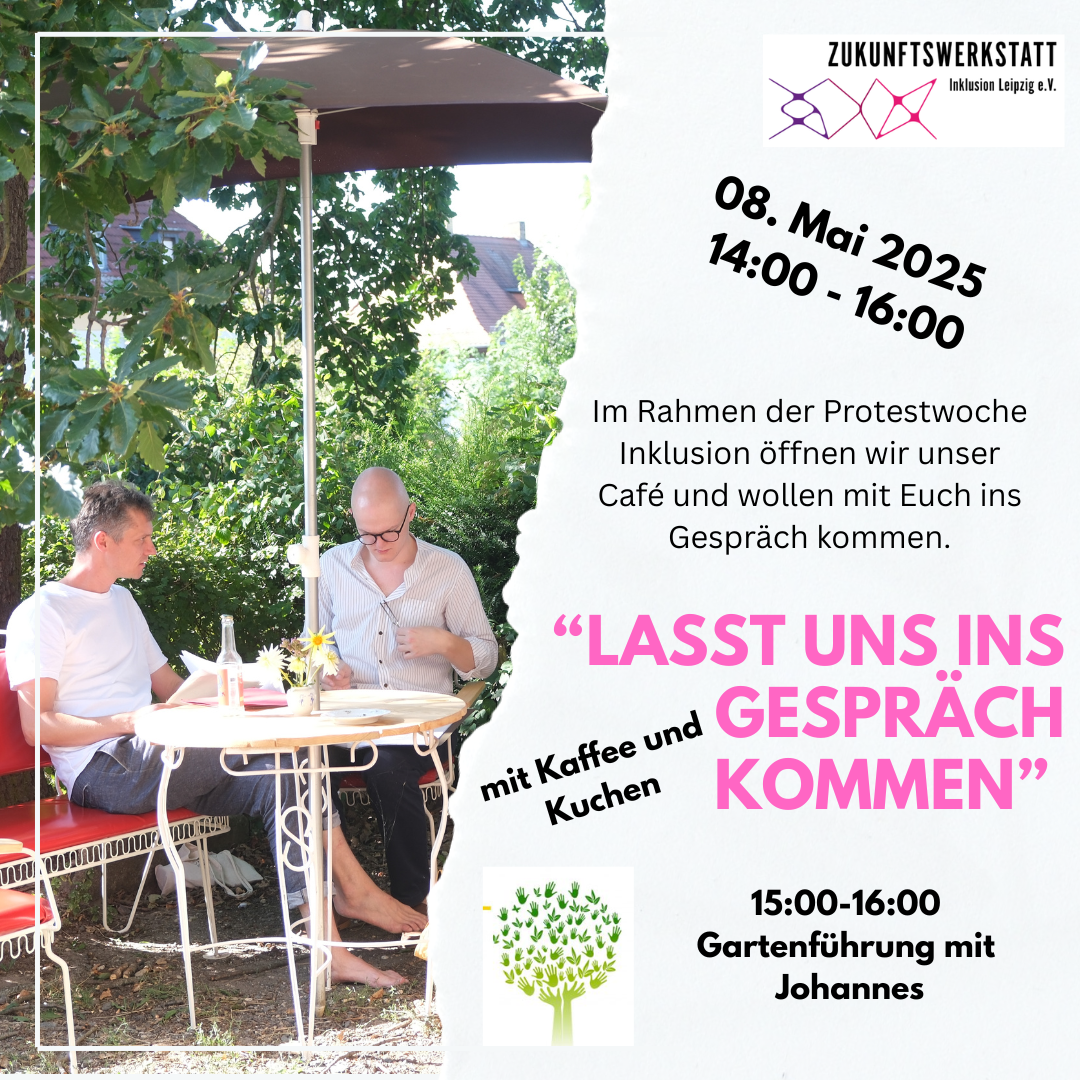 Johannis·höheWir ver·anstalten ein Garten·café zur Protest·woche "Inklusion ist Teil der Lösung". Die gesamte Protest·woche geht vom 5. bis zum 10. Mai. Kommt uns be·suchen! Kommt mit uns ins Ge·spräch! Und ge·nießt unseren Garten! :)